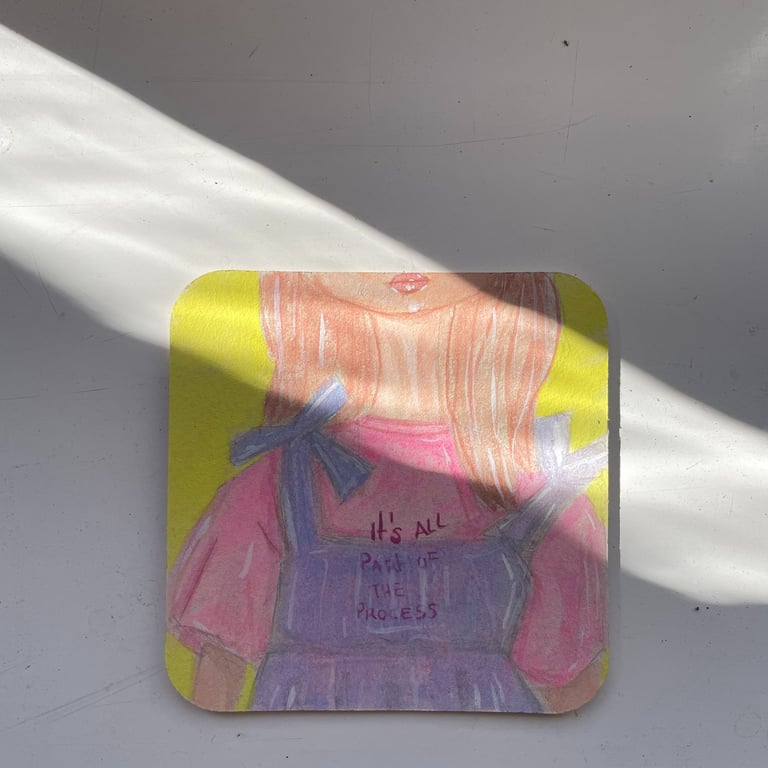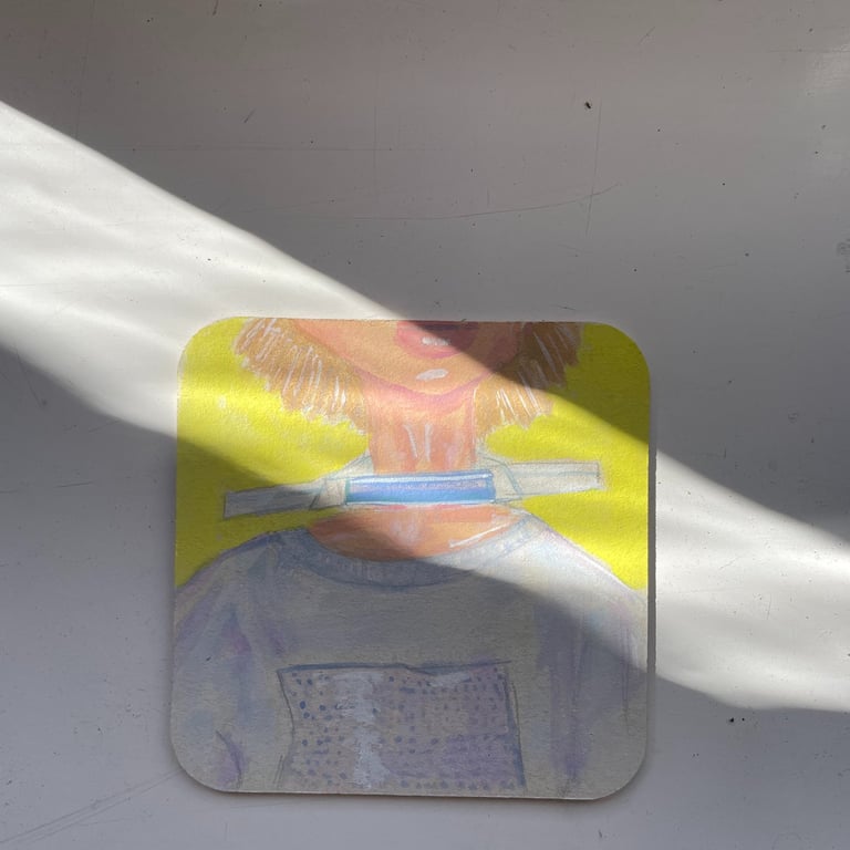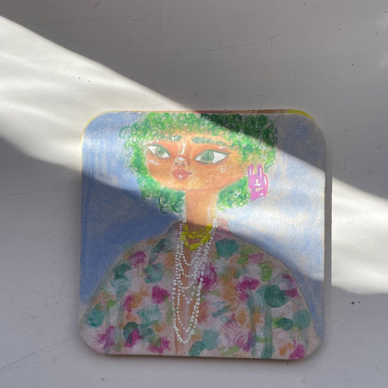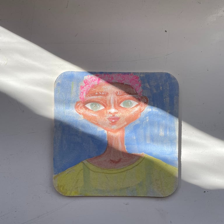 Little paintings of women's portraiture and close-ups made with Gouache on paper coasters.